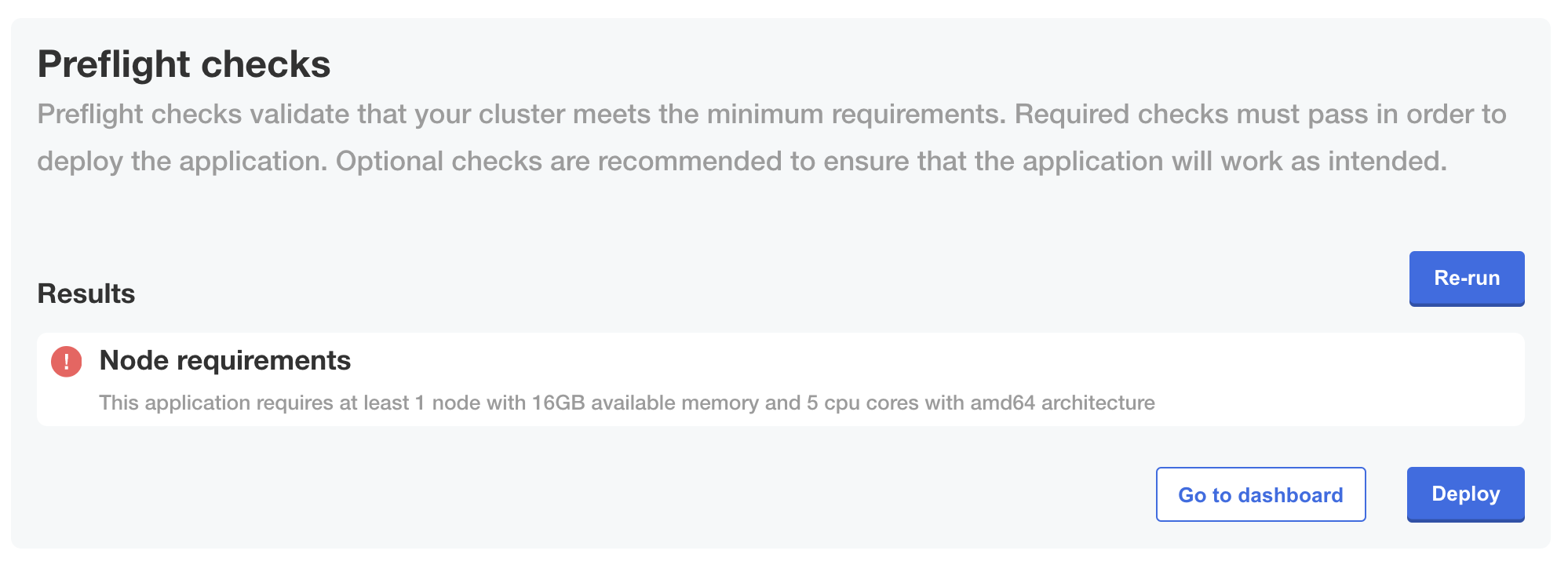 The following shows how a fail outcome for this preflight check is displayed in the Admin Console during KOTS installation or upgrade: